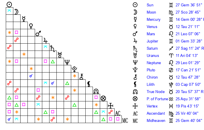 | Jupiter | 0 Taurus 27 | 13 Gemini 9 | 14 Taurus 32 |