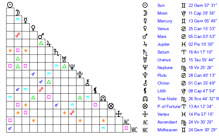 | Sun | 22 Gemini 57 | 23 Gemini 53 | 16 Virgo 20 |
