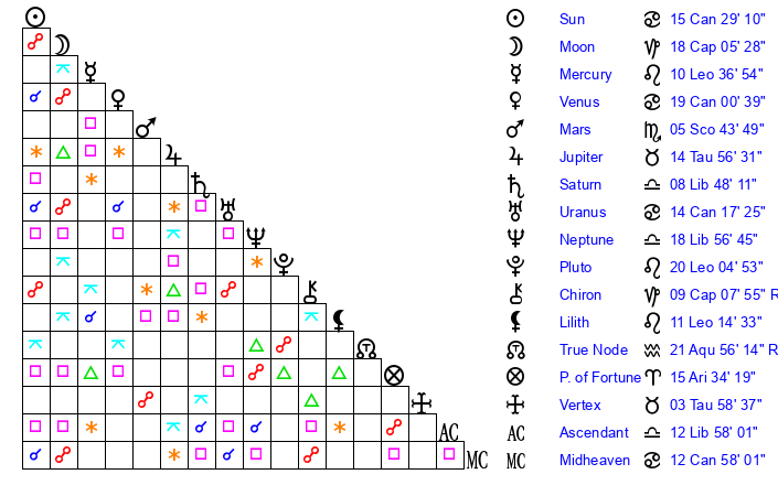 | Moon | 18 Capricorn 0 | 9 Sagittarius 30 | 19 Virgo 9 |