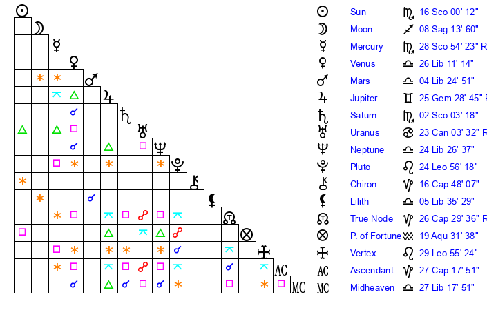 | Sun | 16 Scorpio 0 | 16 Scorpio 32 | 29 Capricorn 6 |