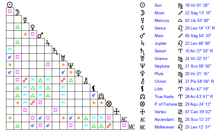 | Pluto | 20 Virgo 22 | 1 Aquarius 35 | 22 Virgo 15 |