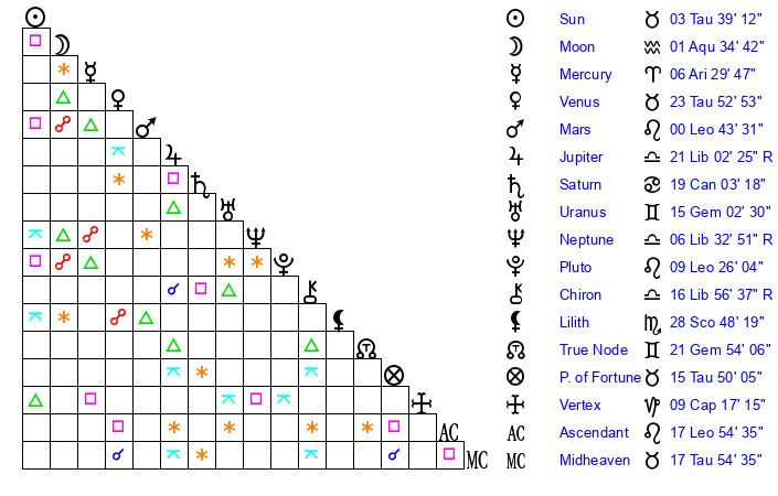 | Venus | 23 Taurus 54 | 27 Pisces 1 | 28 Leo 27 |