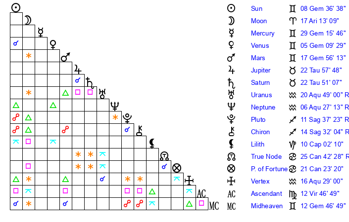 Mars | 17 Gemini 57 | 19 Leo 51 | 4 Cancer 49 |
