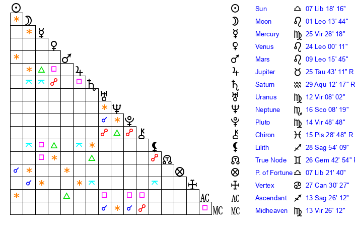 | Pluto | 14 Virgo 49 | 1 Aquarius 24 | 16 Virgo 15 |