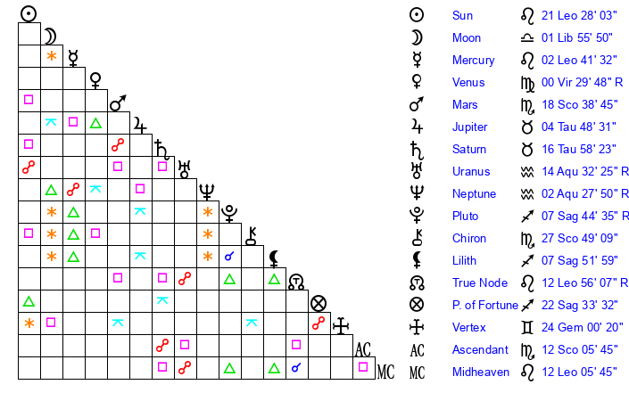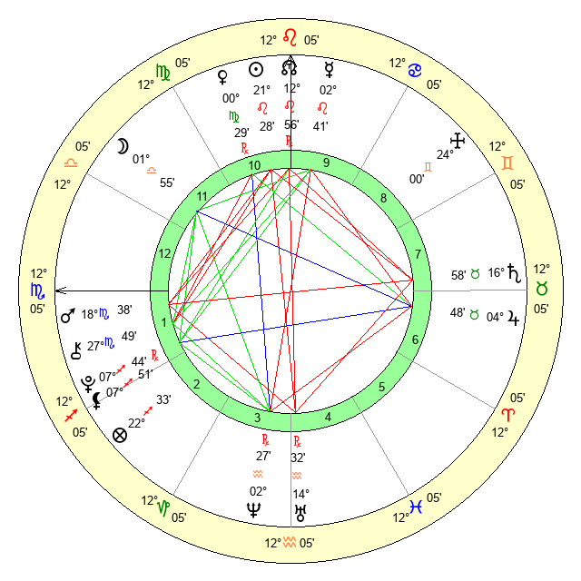 | Moon | 2 Libra 0 | 2 Taurus 2 | 13 Virgo 52 |