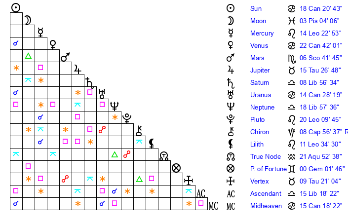 | Moon | 2 Pisces 59 | 16 Capricorn 59 | 26 Libra 3 |
