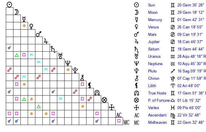 Sun | 20 Gemini 36 | 21 Gemini 1 | 12 Cancer 33 |