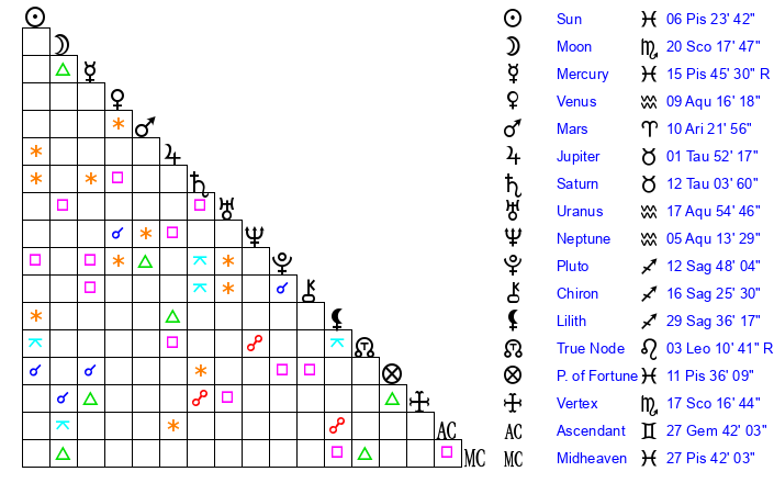 | Moon | 20 Scorpio 18 | 6 Aquarius 26 | 20 Libra 2 |