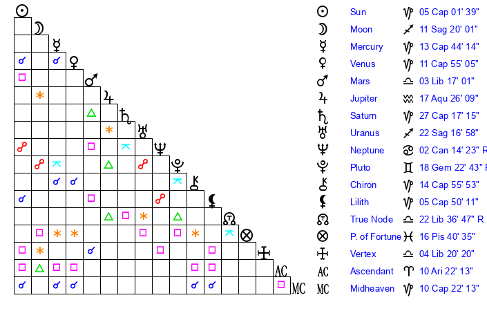 | Saturn | 27 Capricorn 44 | 14 Pisces 9 | 9 Aquarius 24 |