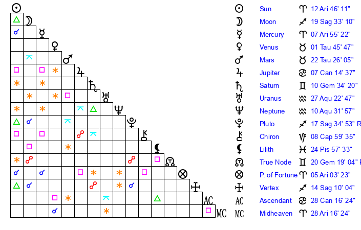 Sun | 12 Aries 47 | 13 Aries 12 | 5 Taurus 19 |