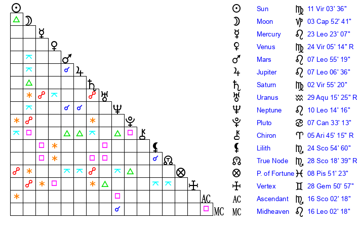 | Saturn | 3 Virgo 34 | 29 Pisces 38 | 12 Virgo 23 |