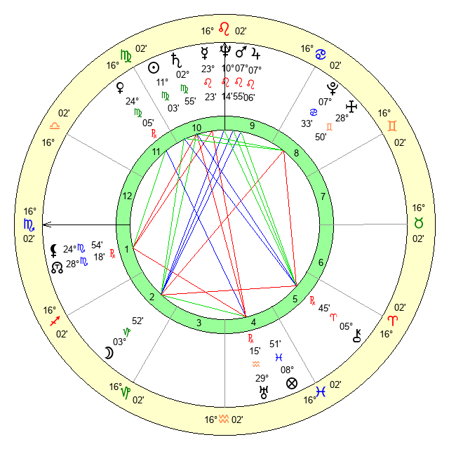 | Venus | 24 Virgo 4 | 11 Leo 58 | 11 Scorpio 47 |