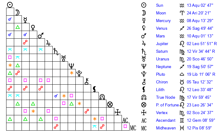 | Moon | 24 Aries 17 | 6 Aries 22 | 16 Sagittarius 53 |