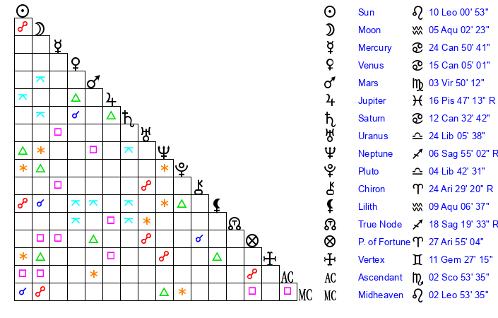 | Moon | 5 Aquarius 1 | 23 Scorpio 31 | 22 Sagittarius 50 |