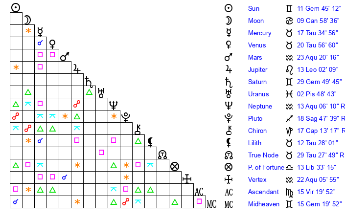 Sun | 11 Gemini 45 | 12 Gemini 24 | 2 Cancer 47 |