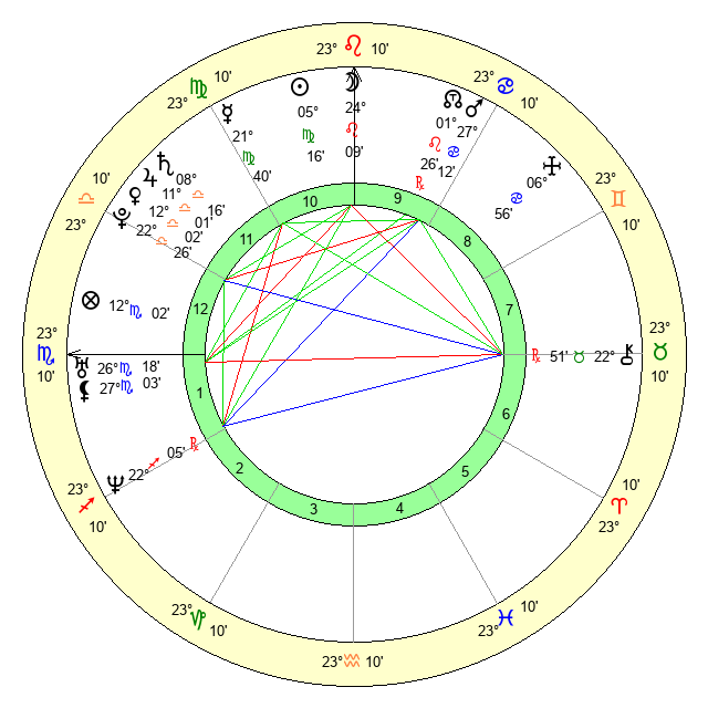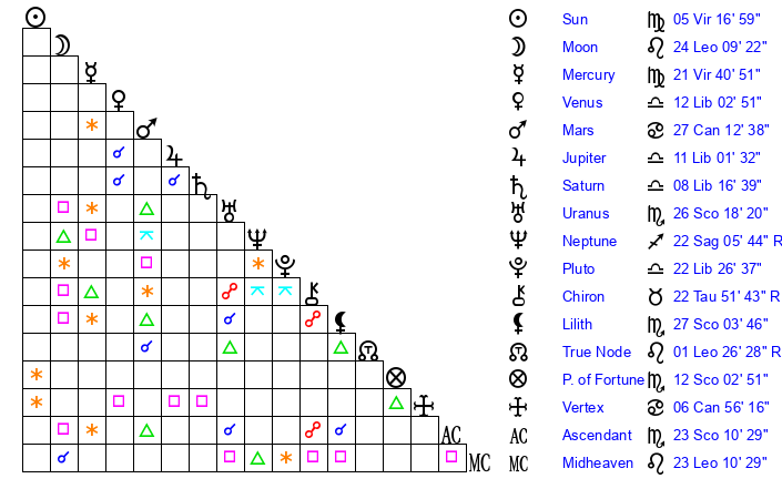 | Moon | 24 Leo 1 | 7 Scorpio 46 | 23 Pisces 22 |