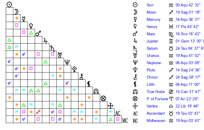 Uranus | 19 Aquarius 41 | 23 Taurus 19 | 21 Aquarius 3 |