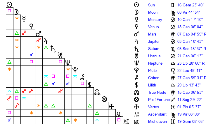 | Mercury | 10 Cancer 17 | 27 Gemini 27 | 19 Leo 54 |
