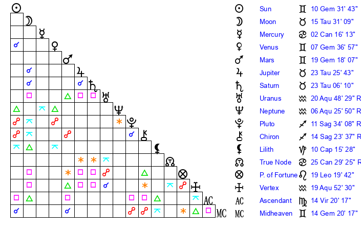 Jupiter | 23 Taurus 29 | 27 Gemini 56 | 29 Taurus 5 |