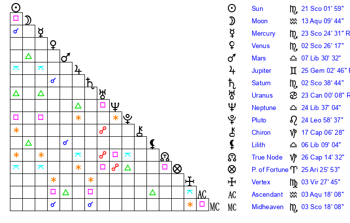 | Sun | 21 Scorpio 1 | 21 Scorpio 34 | 4 Aquarius 11 |