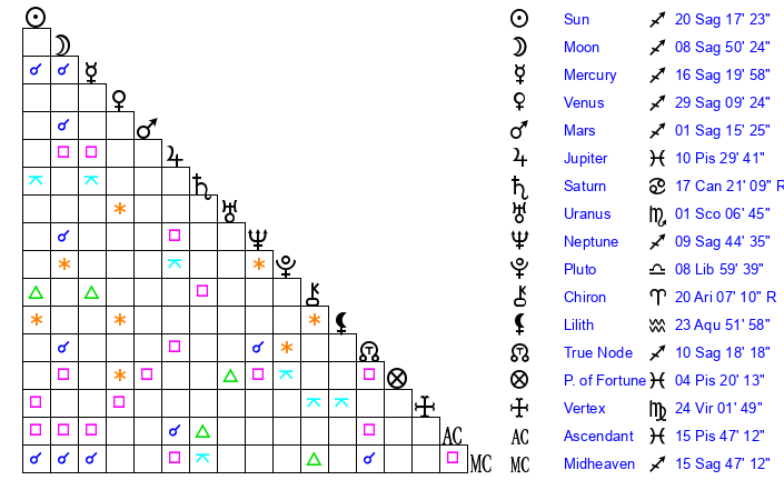| Sun | 20 Sagittarius 17 | 21 Sagittarius 10 | 11 Aquarius 12 |
