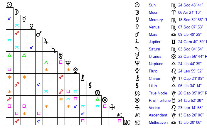| Neptune | 24 Libra 45 | 29 Pisces 30 | 26 Libra 4 |