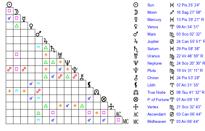 | Sun | 12 Pisces 26 | 13 Pisces 22 | 9 Taurus 40 |