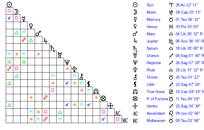 | Neptune | 26 Sagittarius 58 | 0 Aries 37 | 26 Sagittarius 9 |