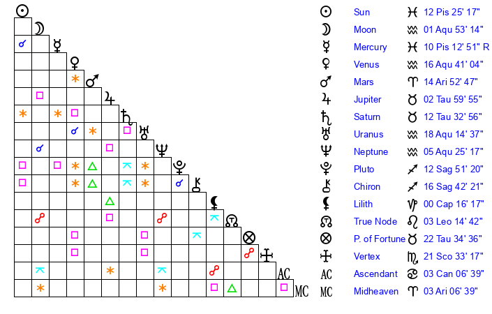 | Neptune | 5 Aquarius 25 | 28 Pisces 57 | 6 Aquarius 5 |
