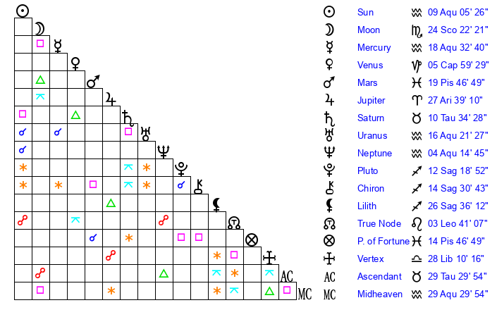 | Moon | 24 Scorpio 22 | 12 Aquarius 20 | 25 Libra 12 |