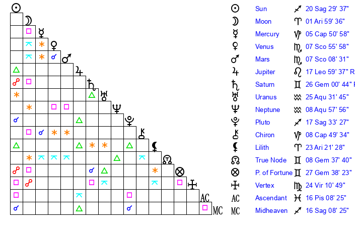 | Pluto | 17 Sagittarius 34 | 0 Aquarius 30 | 18 Sagittarius 23 |