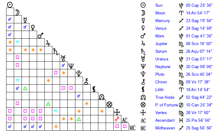 Sun | 0 Capricorn 25 | 0 Capricorn 54 | 2 Aquarius 0 |