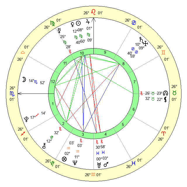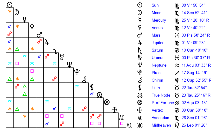 Venus | 12 Virgo 41 | 8 Leo 24 | 10 Libra 0 |