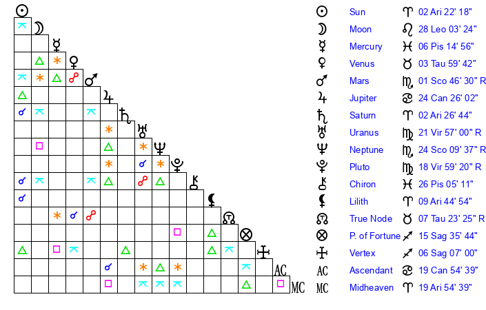 | Sun | 2 Aries 23 | 3 Aries 19 | 28 Taurus 59 |