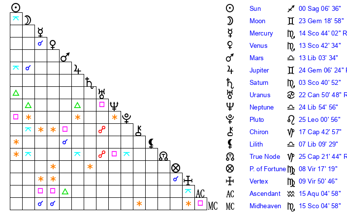 | Moon | 23 Gemini 15 | 27 Sagittarius 9 | 0 Aquarius 47 |