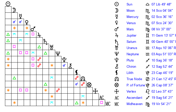 Moon | 14 Scorpio 9 | 15 Capricorn 51 | 12 Libra 14 |