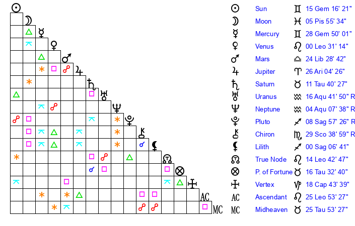 Jupiter | 26 Aries 9 | 29 Gemini 13 | 0 Taurus 42 |