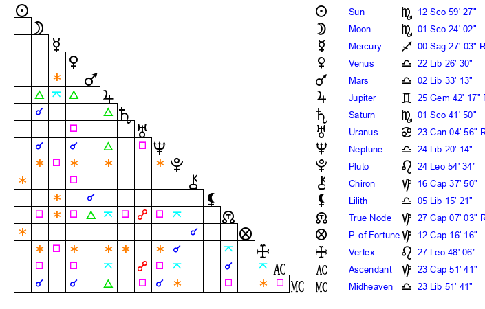 | Sun | 12 Scorpio 59 | 13 Scorpio 32 | 26 Capricorn 2 |