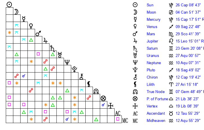 Sun | 26 Capricorn 9 | 26 Capricorn 49 | 18 Aquarius 30 |