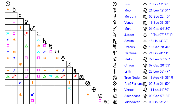 | Moon | 21 Leo 45 | 19 Cancer 52 | 27 Aries 52 |
