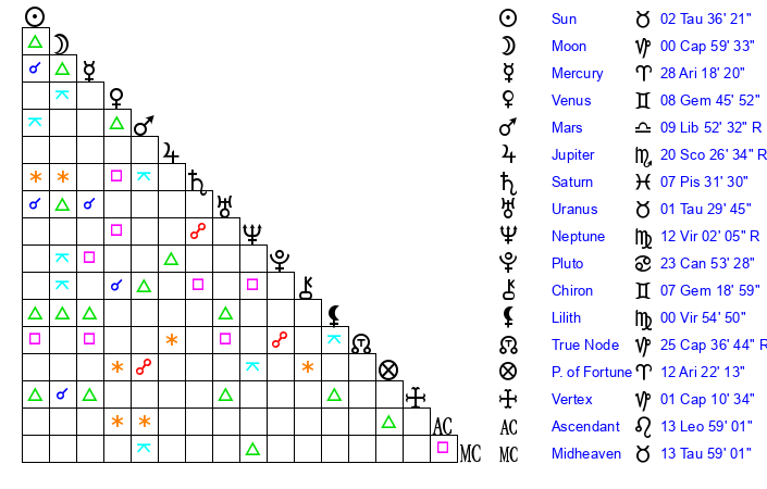 | Moon | 1 Capricorn 1 | 6 Pisces 54 | 27 Aries 28 |