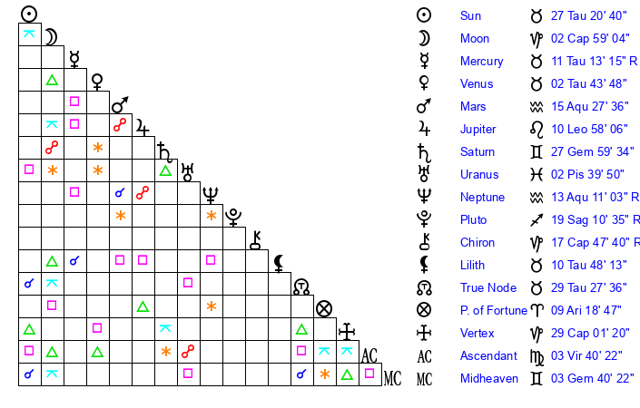 Sun | 27 Taurus 21 | 28 Taurus 0 | 18 Gemini 27 |