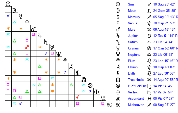 | Sun | 10 Sagittarius 29 | 10 Sagittarius 46 | 24 Aquarius 42 |