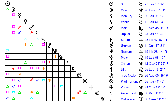 | Sun | 23 Taurus 49 | 24 Taurus 9 | 3 Leo 37 |