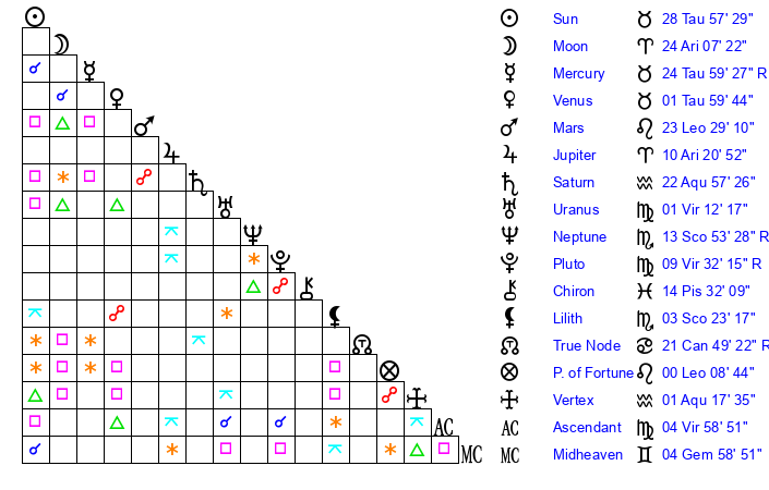 | Moon | 24 Aries 10 | 2 Pisces 27 | 8 Leo 51 |