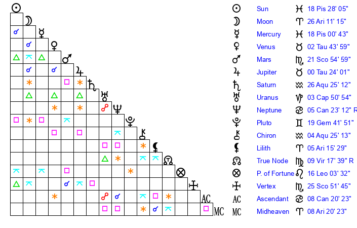 | Sun | 18 Pisces 28 | 19 Pisces 22 | 14 Cancer 52 |