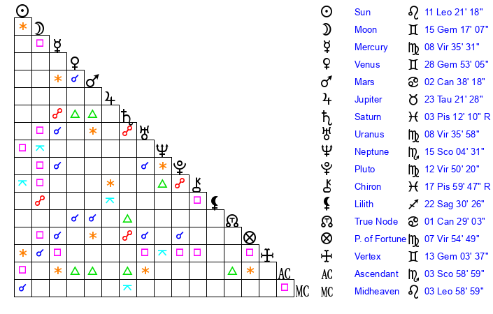 | Neptune | 15 Scorpio 4 | 1 Aries 56 | 16 Scorpio 14 |