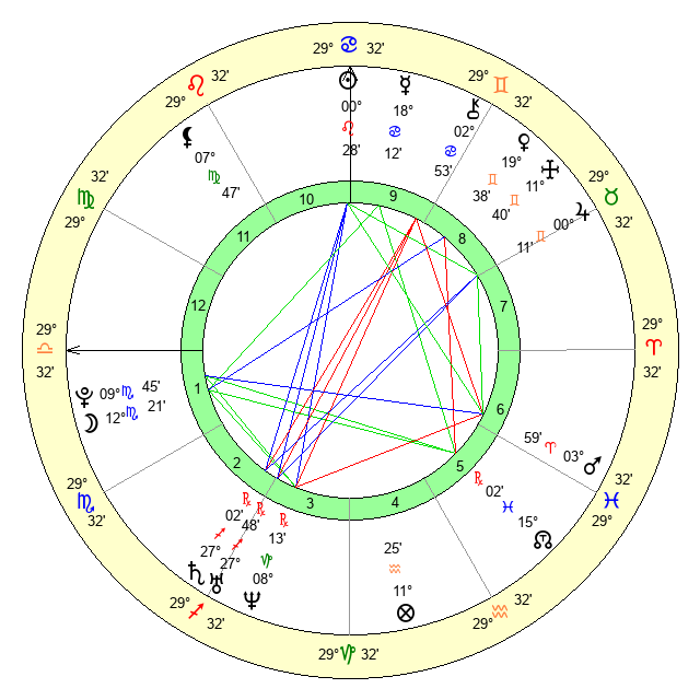 | Moon | 12 Scorpio 13 | 8 Cancer 33 | 29 Pisces 33 |