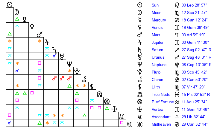 | Mercury | 18 Cancer 12 | 14 Leo 35 | 27 Virgo 28 |