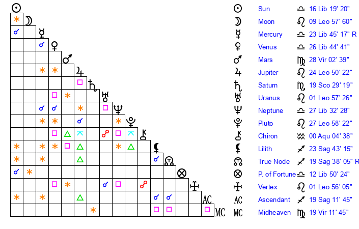 | Saturn | 19 Scorpio 56 | 26 Pisces 57 | 28 Scorpio 0 |